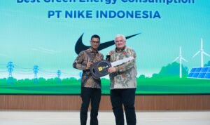 Penyerahan penghargaan kategori Best Green Energy Consumption oleh Direktur Utama PLN, Darmawan Prasodjo (kiri) kepada President Director PT Nike Indonesia, Joseph Warren (kanan).