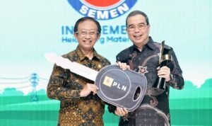 Penyerahan penghargaan kategori Best Energy Consumption oleh Direktur Niaga PLN, Adi Priyanto (kiri) kepada Direktur Utama PT Indocement Tunggal Prakarsa, Christian Kartawijaya (kanan).