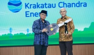 Penyerahan penghargaan kategori Best Energy Growth oleh Komisaris Utama PLN, Burhanuddin Abdullah (kiri) kepada Direktur Utama PT Krakatau Chandra Energi, Rahmad Hidayat (kanan).