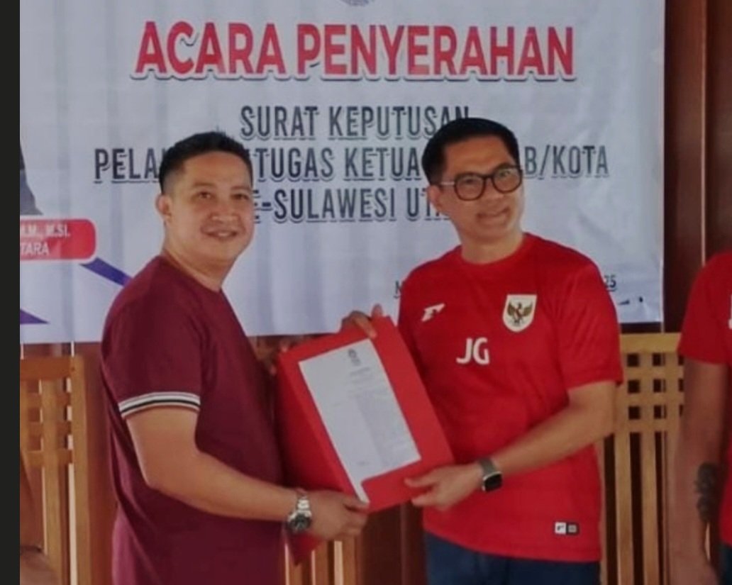 Hal ini dibuktikan Joune Ganda dengan menyerahkan 7 Surat Keputusan (SK) Pelaksana Tugas (Plt) Ketua PSSI Kabupaten dan Kota, Selasa (30/10/2025) di Villa Rae Desa Kaima.