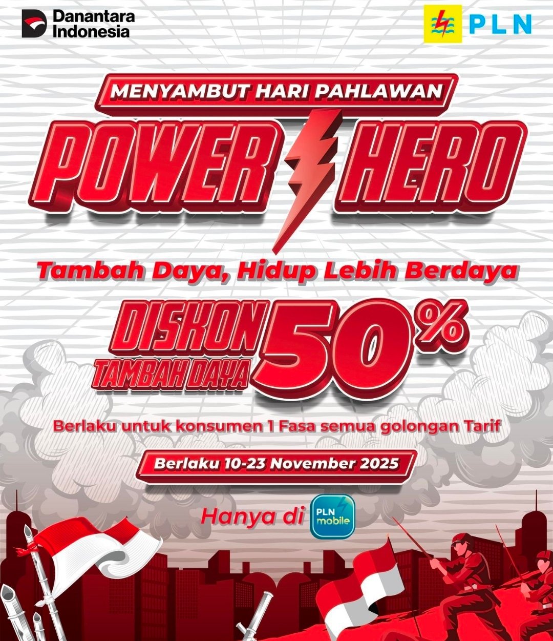 ONLINEBRIYA.COM, JAKARTA – Dalam semangat memperingati Hari Pahlawan 2025, PT PLN (Persero) menghadirkan program promo bertajuk “Power Hero”, yang memberikan diskon 50% untuk biaya tambah daya listrik bagi pelanggan setia. Promo ini berlangsung secara nasional mulai 10 hingga 23 November 2025 dan dapat diakses dengan mudah melalui aplikasi PLN Mobile.