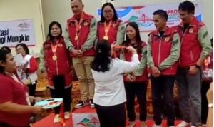 Foto: Pengalungan medali emas dilakukan oleh Kadis Dikbud Tomohon Juliana Dolvin Karwur sebagai pendamping Tim Bridge bersama Kabag Promopim Christo Kalumata.