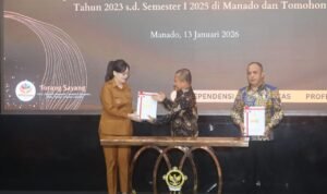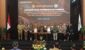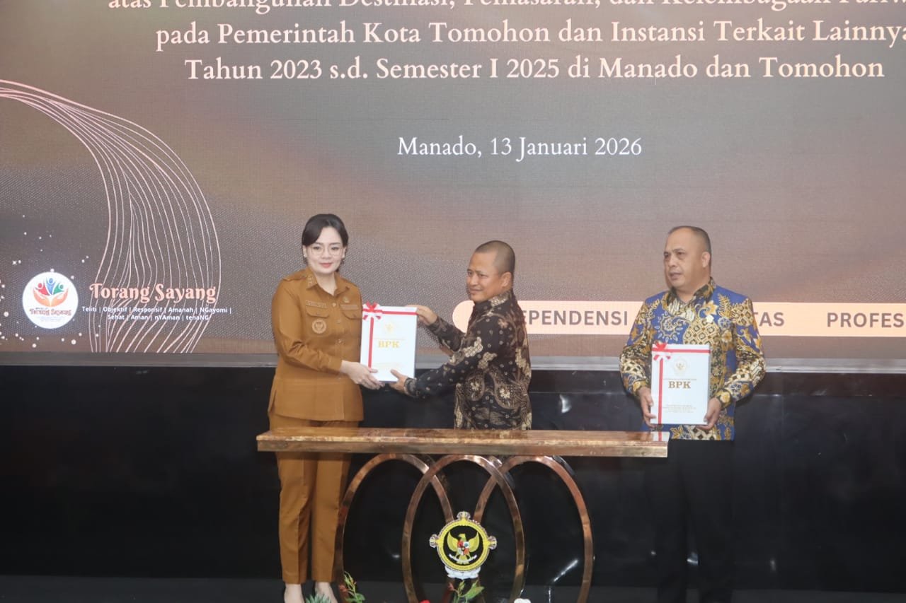 Penyerahan LHP dilakukan secara resmi oleh Kepala BPK Perwakilan Provinsi Sulawesi Utara Bombit Agus Mulyo SE MM AkCA ERMAP GRCP GRCA CSFA, dan diterima oleh Wakil Wali Kota Tomohon Sendy G A Rumajar SE MIKom dan Wakil Ketua DPRD Kota Tomohon Jefry Polii SIK, di Kantor BPK Perwakilan Provinsi Sulawesi Utara, Selasa (13/01/2025).