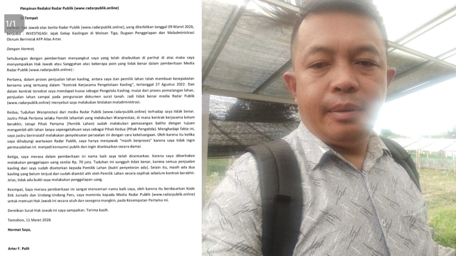 ONLINEBRITA.COM, TOMOHON – Arter F. Palit menyampaikan hak jawab atas pemberitaan media Radar Publik (www.radarpublik.online�) yang terbit pada 9 Maret 2026 berjudul “Investigasi: Jejak Gelap Kavlingan di Woloan Tiga; Dugaan Penggelapan dan Maladministrasi Oknum Berinisial AFP Alias Arter.”